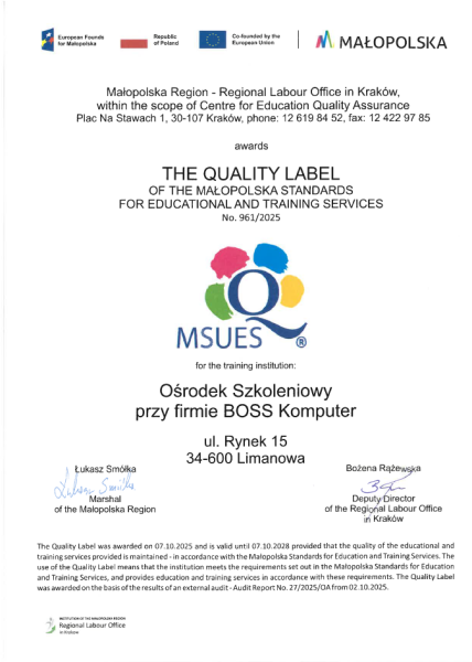 Ośrodek Szkoleniowy Boss Komputer w Limanowej to certyfikowane laboratorium ECDL. Od 1998 roku prowadzimy szkolenia dla osób indywidualnych, bezrobotnych i pracujących, oraz dla przedsiębiorstw i instytucji pożytku publicznego, takich jak Powiatowe Urzędy Pracy. Posiadamy Akredytację Małopolskiego Kuratora Oświaty w Krakowie. Podpisaliśmy także umowę z Wojewódzkim Urzędem Pracy w Krakowie na realizację projektu „Kierunek Kariera” oraz Kierunku „Kariera Zawodowa”.